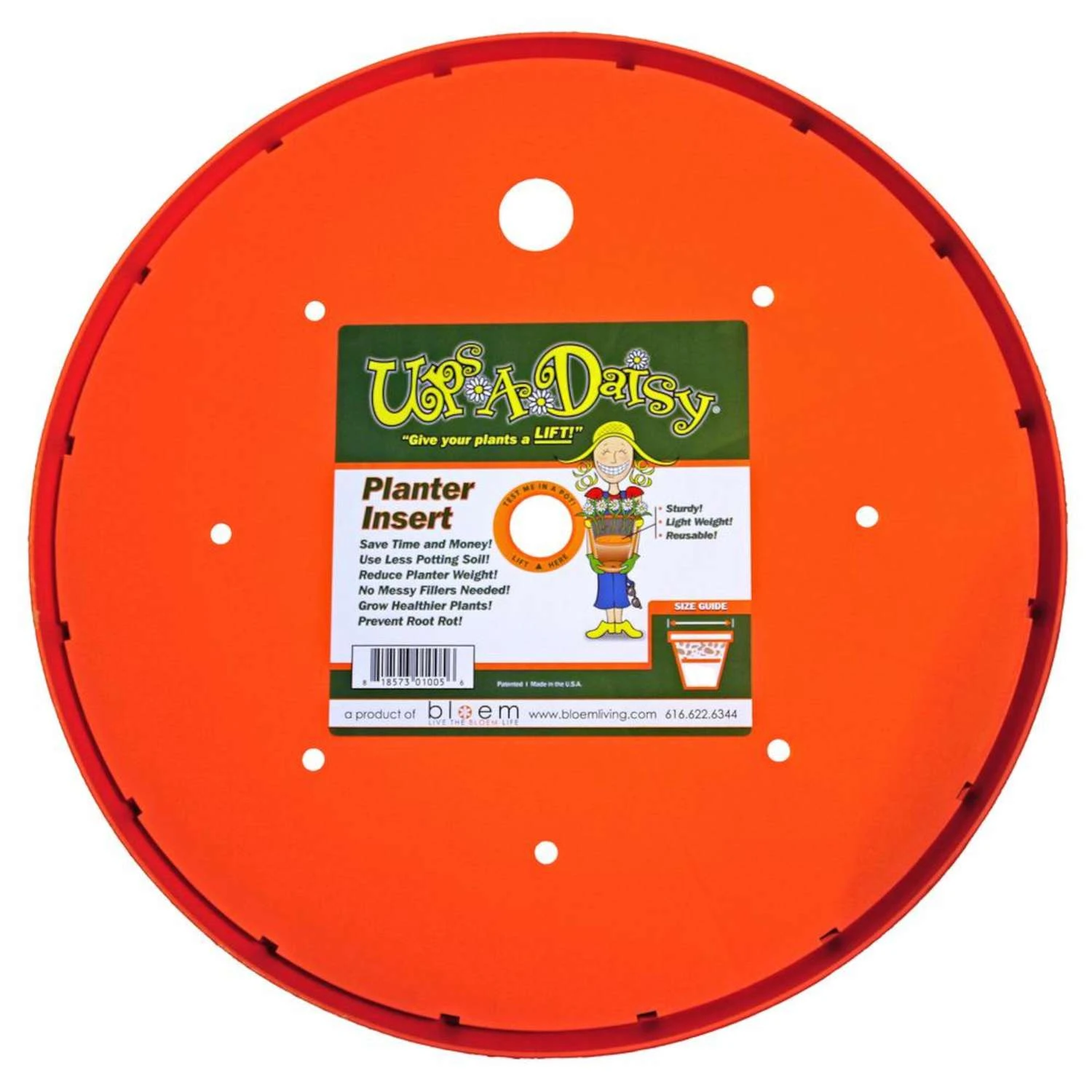 Enjoy healthier plants with larger blooms with an Ups-A-Daisy insert. Use less dirt, save money, prevent root rot, reduce planter weight with this simple-to-use reusable planter insert. Ups-A-Daisy sets inside your planter approximately 1/2 to 3/4 of the way down into your container. Measure inside width of planter 1/2 to 3/4 of the way down to determine the Ups-A-Daisy size needed. With an Ups-a-Daisy insert your potted plants & flowers are sure to have healthier roots, produce bigger & more brilliant blooms, and grow faster than ever before. Provides proper drainage and oxygen for healthy root growth Inserts include drainage holes to help protect against over-watering Inserts are reusable and extremely strong