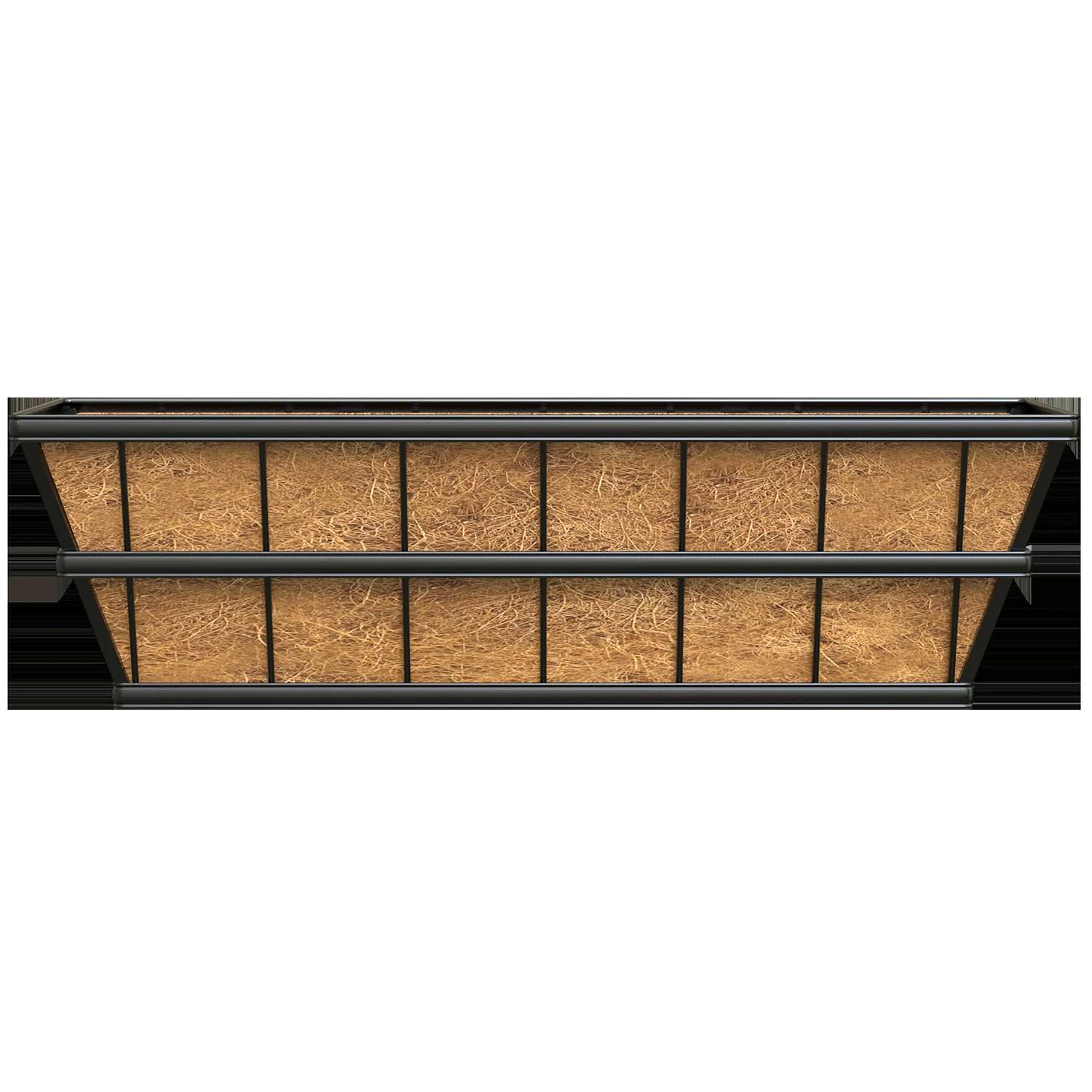 Transform a section of your deck into a plant showcase using this Panacea Black Modern Farmhouse Deck Planter Box. Horizontal, steel slats with a slightly stepped design bring striking texture to the planter, contrasting the round vertical rods and square bar corners. The generous, open top tapers toward the base, furthering the bold angles and the shape contrasts the curves of your blooms for a fun effect. Its black color and included, brown coco fiber liner offer a classic effect and keyhole openings on the back of the piece make it easy to place it against a wall. For a different look, rest the level base on the ground or your horizontal, wooden deck rail Its steel frame remains lovely for use again and again and a plastic liner inside the fiber one offers plenty of moisture retention Make a fantastic statement on your deck or fence using this black modern farmhouse deck planter box