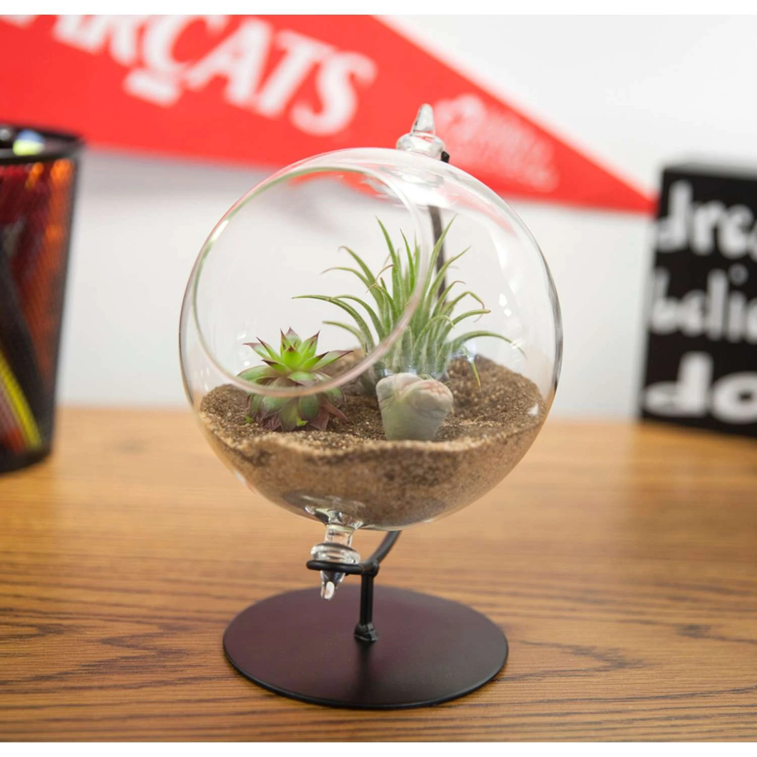 Enhance your desk with charming greenery using this Desktop Glass Terrarium with Metal Stand. This adorable, circular vessel sits in a custom metal holder easily and wonderfully showcases a few small plants. Finials at both the top and base of the vessel slide into openings on the artistic, metal stand, keeping the terrarium upright and resting levelly on your table or windowsill. Reach through the 2.75″ diameter opening on the front of the piece to add plants and substrate, which remain visible through the clear glass. A 3.375″ diameter disc forms the stable base for the metal stand and its single-arm arches perfectly behind the planter for a precise fit. The black color of the metal stand meshes with many settings and makes viewing and maintaining your plants simple. Adds a burst of life and greenery to a desk or small workspace Includes a rugged and decorative powder coated black stand Fill it with your favorite succulent, small cactus or air plant Can be used for small office supplies, like paper clips and candy as an alternative desktop container Makes a great gift No assembly tools required