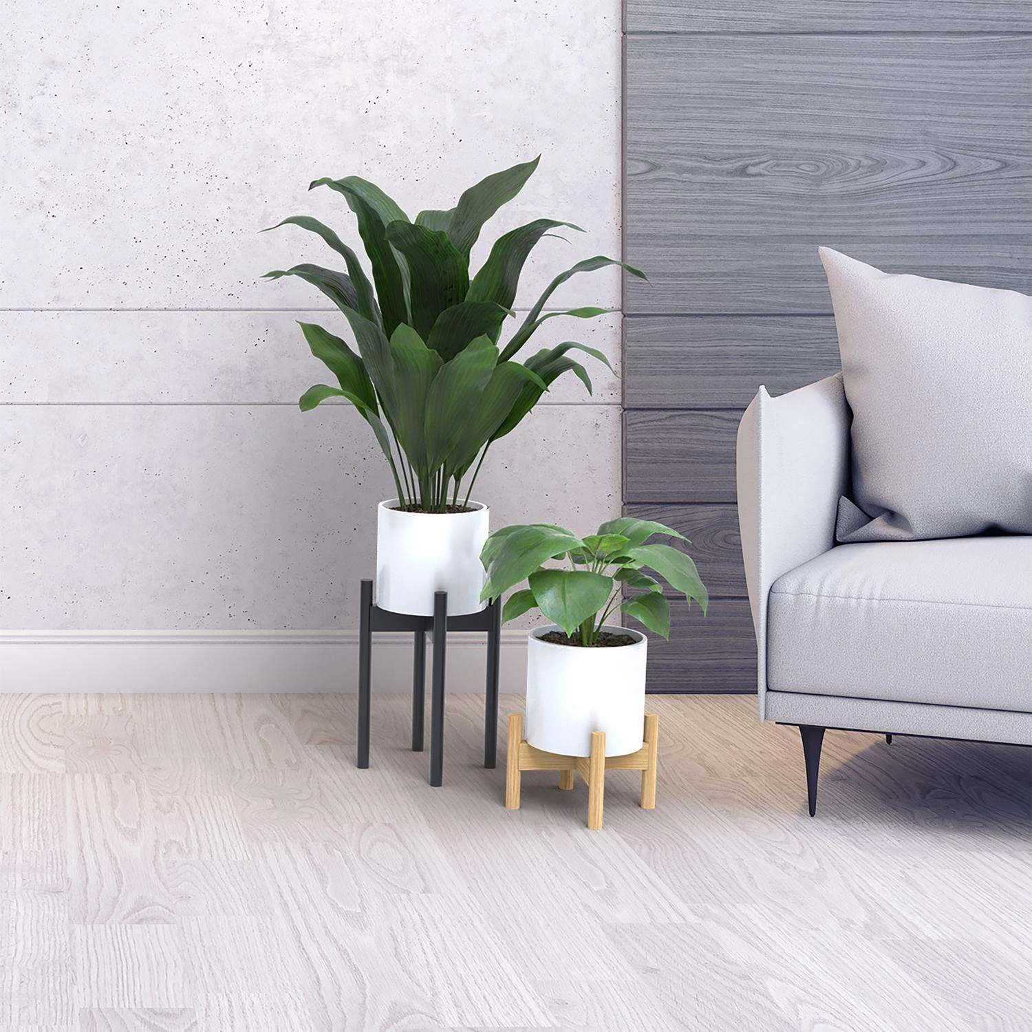 Mid Century wood plant stands takes inspiration from trendy and minimalist home decor and will showcase your potted greenery. The adjustable plant holder has a footed planter design that will support up to 20 lb. Natural wood finish or black Adjustable width feature to achieve a snug fit against pottery 4 extendable rails form a cross bar stand