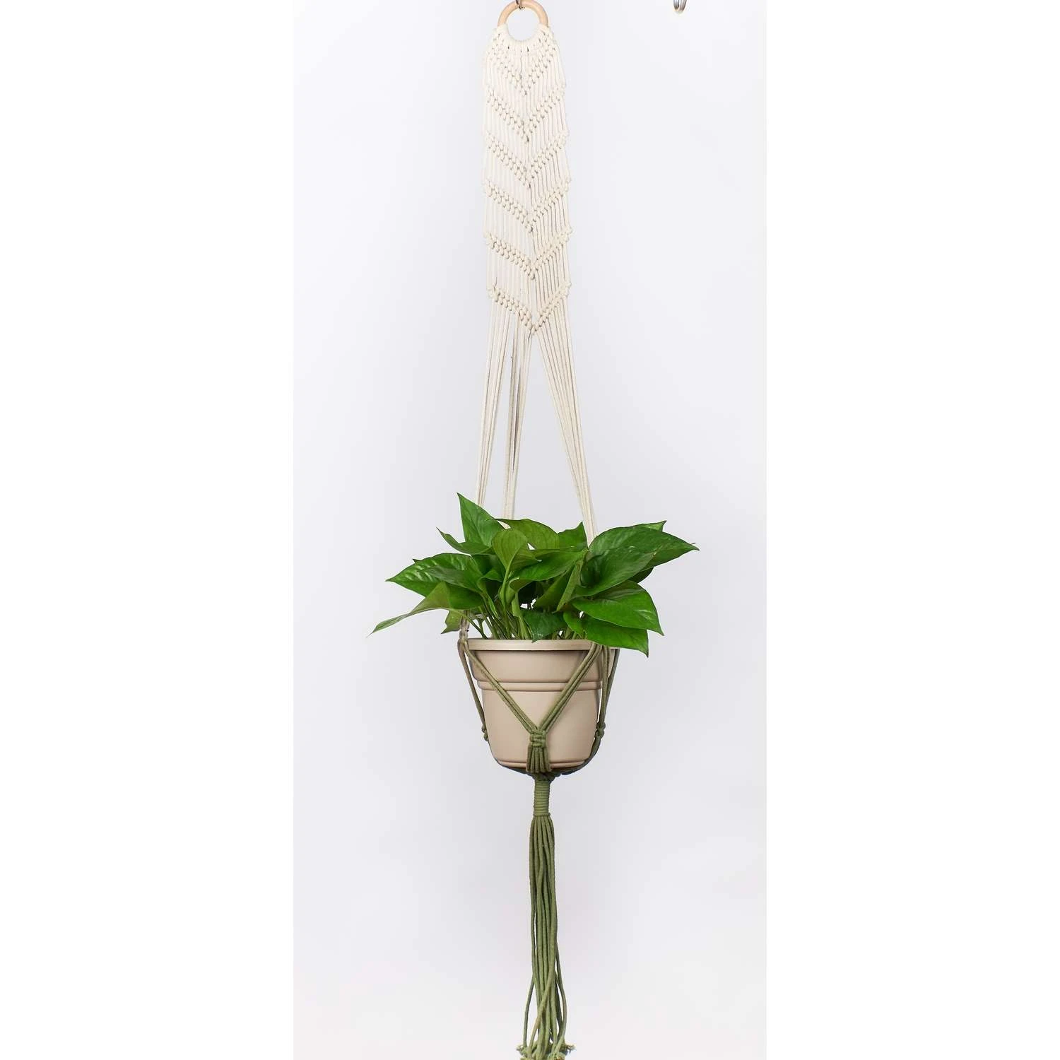 The 48 inch Macrame Plant Hammock is a unique dip dyed plant hanger. Made from 100% cotton, the bottom is dip-dyed to add color. This color matches great with a variety of house plants. The plant will rest in this “hammock” style hanger which separates the cording into three sections. The top section of the hanger is 5 inches wide with unique knotting. A wooden round ring is used at the top to hang on hooks or brackets. Use with Primitive Planters S-Hooks or Hanger Hooks for easy hanging. This is also a perfect hanger to display a gazing globe or glassware. Dip dyed at bottom to add color Unique plant hanger that can hold up to a 7″ pot Easy to use